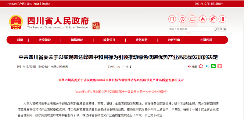 12月8日,中共四川省人民政府在官網(wǎng)發(fā)布了《中共四川省委關(guān)于以實(shí)現(xiàn)碳達(dá)峰碳中和目標(biāo)為引領(lǐng)推動(dòng)綠色低碳優(yōu)勢(shì)產(chǎn)業(yè)高質(zhì)量發(fā)展的決定》(以下簡(jiǎn)稱《方案》)。