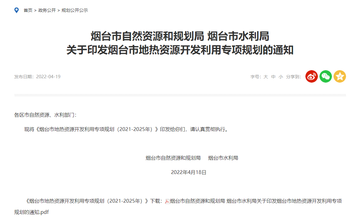 地大熱能地熱+多能互補新聞網訊:近日,煙臺市自然資源和規劃局、煙臺市水利局聯合印發了《煙臺市地熱資源開發利用專項規劃(2021-2025年)》(以下簡稱《規劃》)。